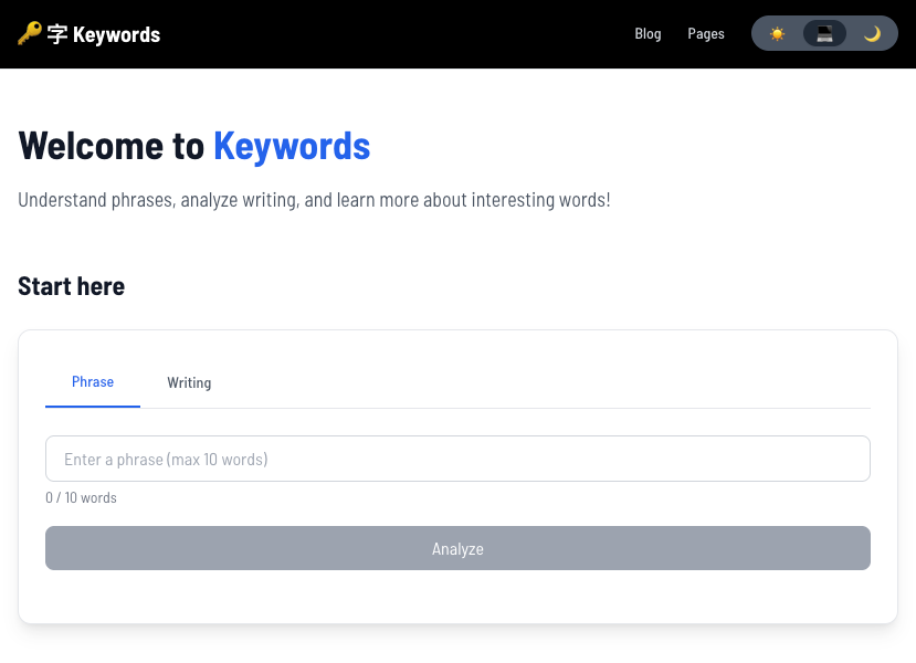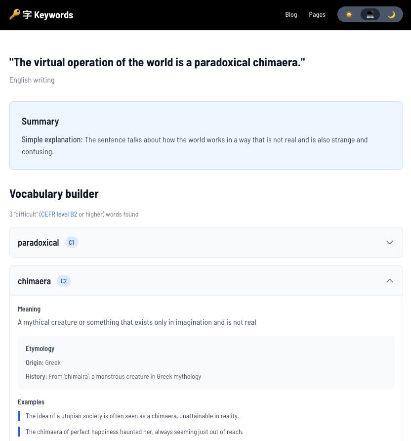 Dictionaries like Wiktionary (of which I am a big fan) couldn't help enough as I had to look up many words at a time, so I created this out of a hope to query short passages more easily!