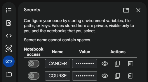 my_secret = userdata.get('SECRET_NAME')Google Colab will show us something like: